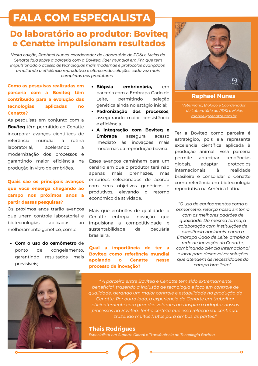 Nesta edição, em Fala com Especialista, o Raphael Nunes destaca a parceria entre Cenatte e Boviteq, que tem impulsionado avanços tecnológicos e ampliado a eficiência reprodutiva.